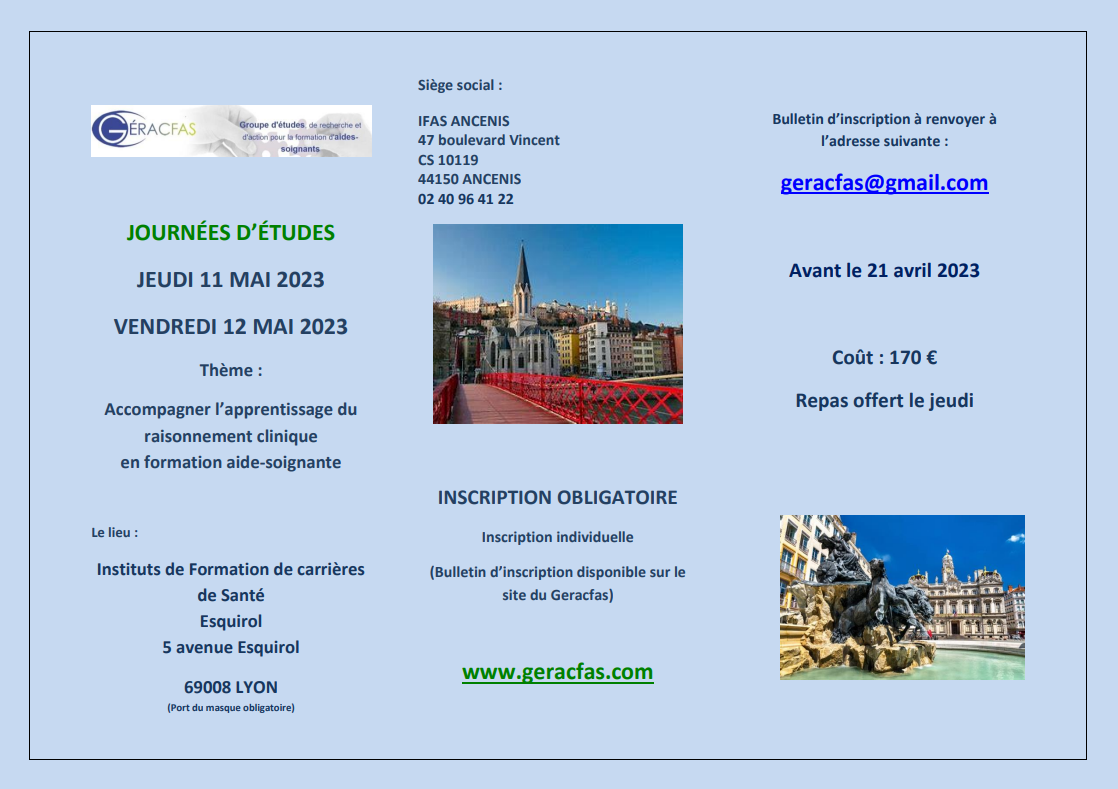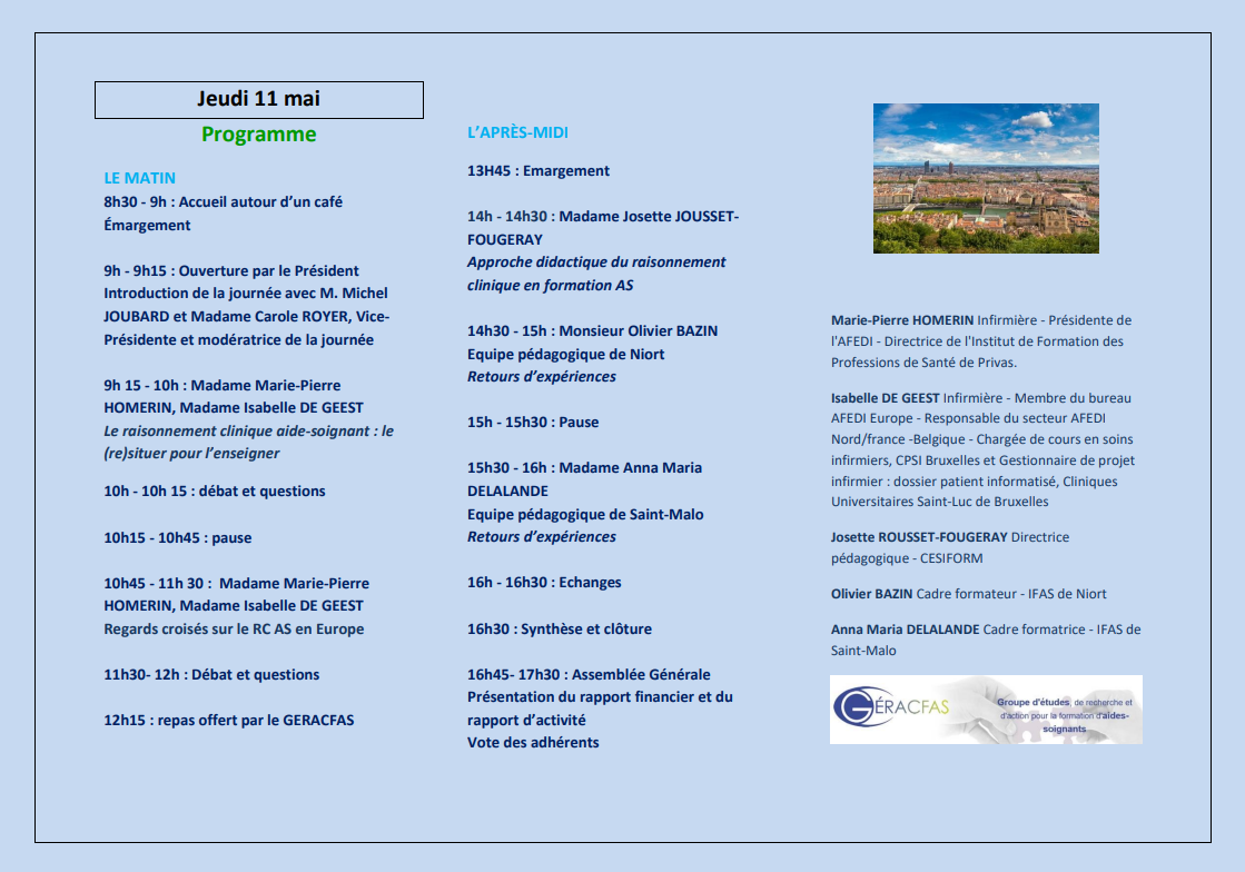 L’après-midi, l’approche didactique du raisonnement clinique en formation aide-soignante sera le préambule aux retours d’expérience de deux IFAS afin de vous faire partager leur enseignement du raisonnement clinique.
