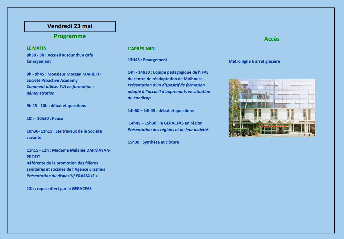 Fidèle à sa mission d’analyse, de veille et de réflexion sur l’évolution des métiers du soin, le GERACFAS propose cette année un programme riche et structurant, construit autour des grandes mutations qui traversent notre système de santé, des transformations des pratiques professionnelles et des enjeux contemporains de la formation.